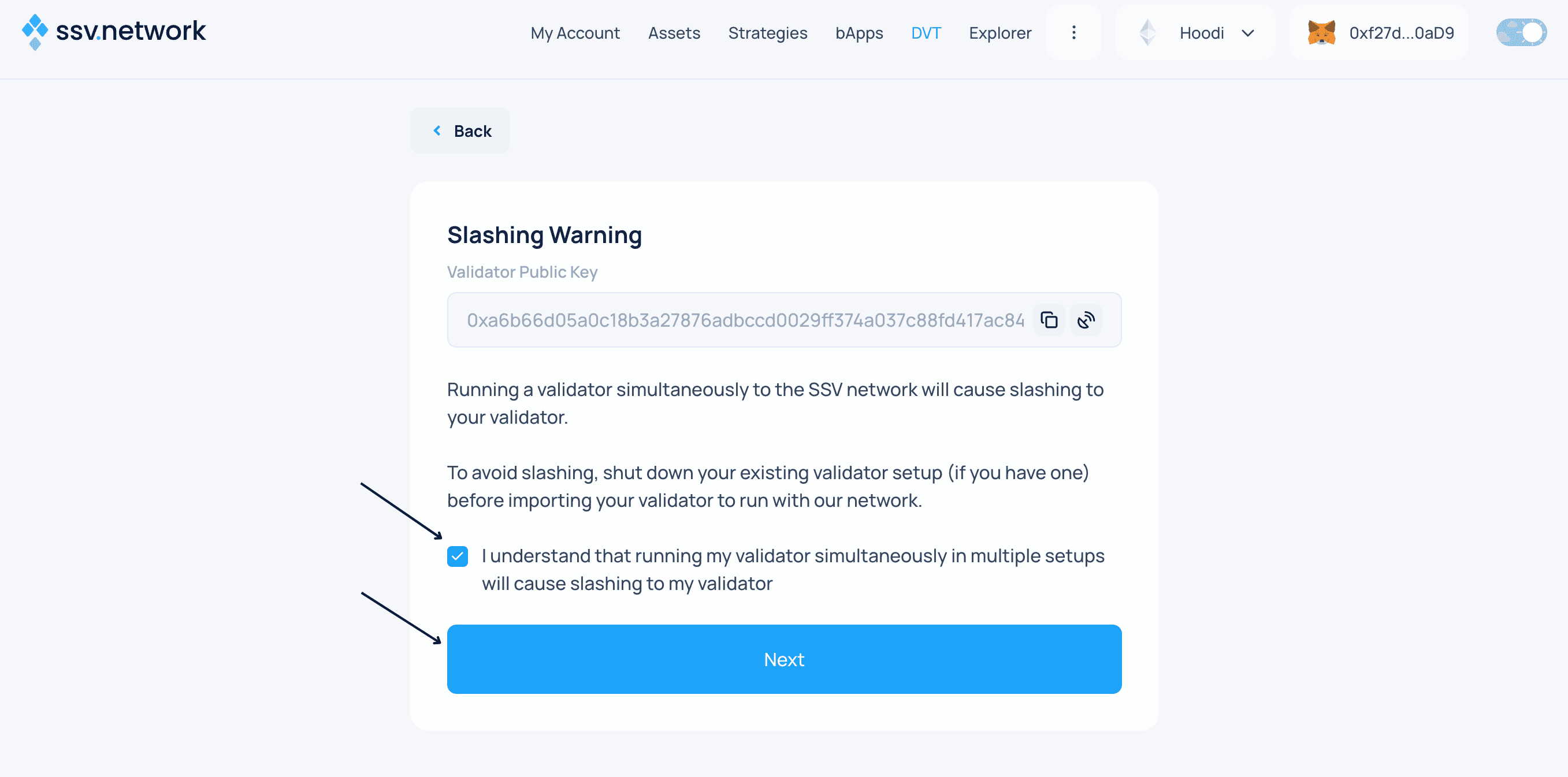 Ensure you have shut down any existing validator clients running this key before proceeding. Running the same validator key on multiple systems simultaneously will result in slashing.