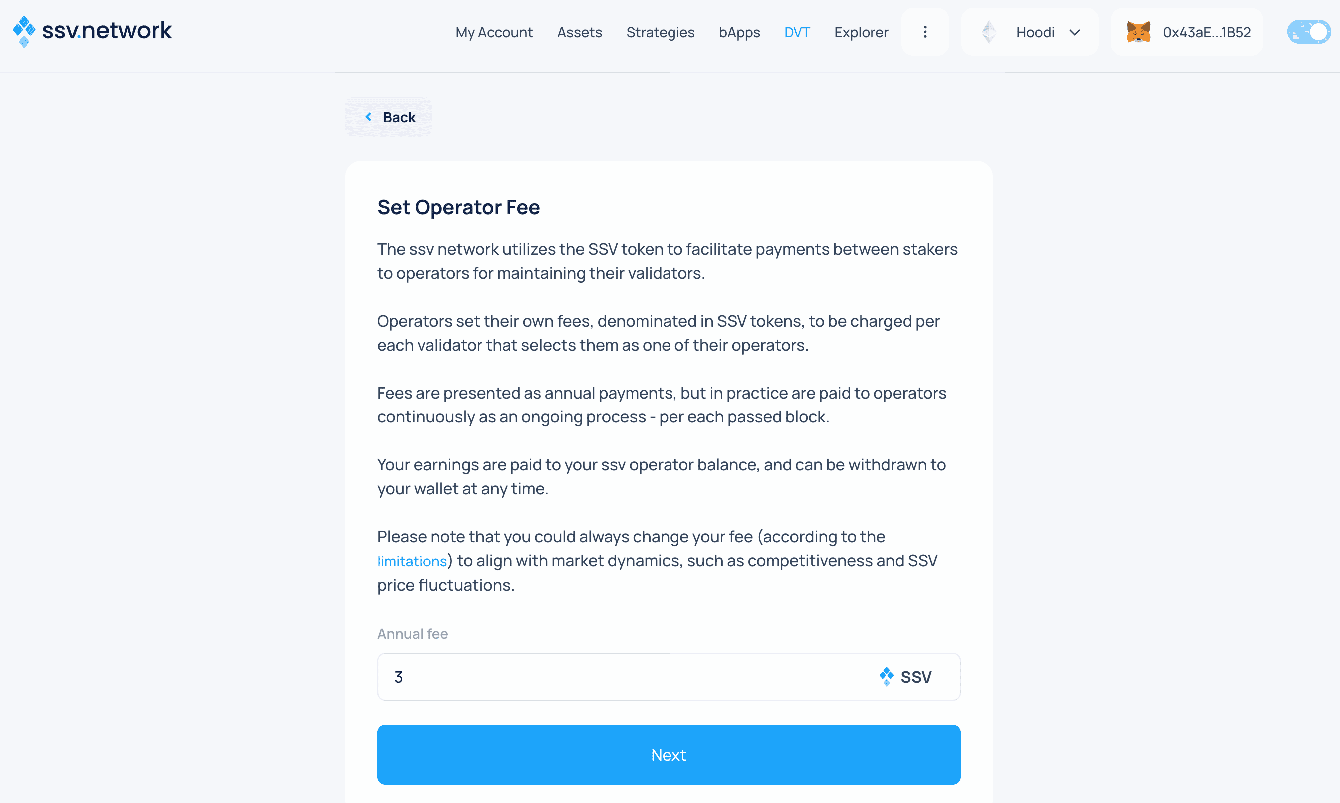 After successfully running an SSV node, an operator must register it to the SSV Network in order to be discoverable by validators. You'll need your operator public key (generated in Step 1) and your desired operator fee (more on fees ↗). The wallet address you use to register will be the only address with management permissions. Follow these steps using the SSV Network web app ↗: